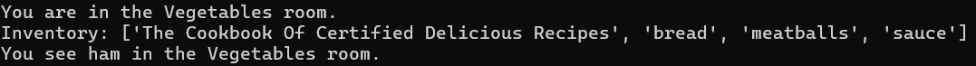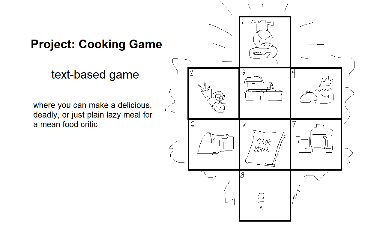 A short text-based game where you are a chef aspiring to have a famous restaurant, and the only thing standing in your way is a mean food critic. Maneuver the arena, collect ingredients, and if you cook him a meal he finds satisfactory, you just may achieve your dream after all.